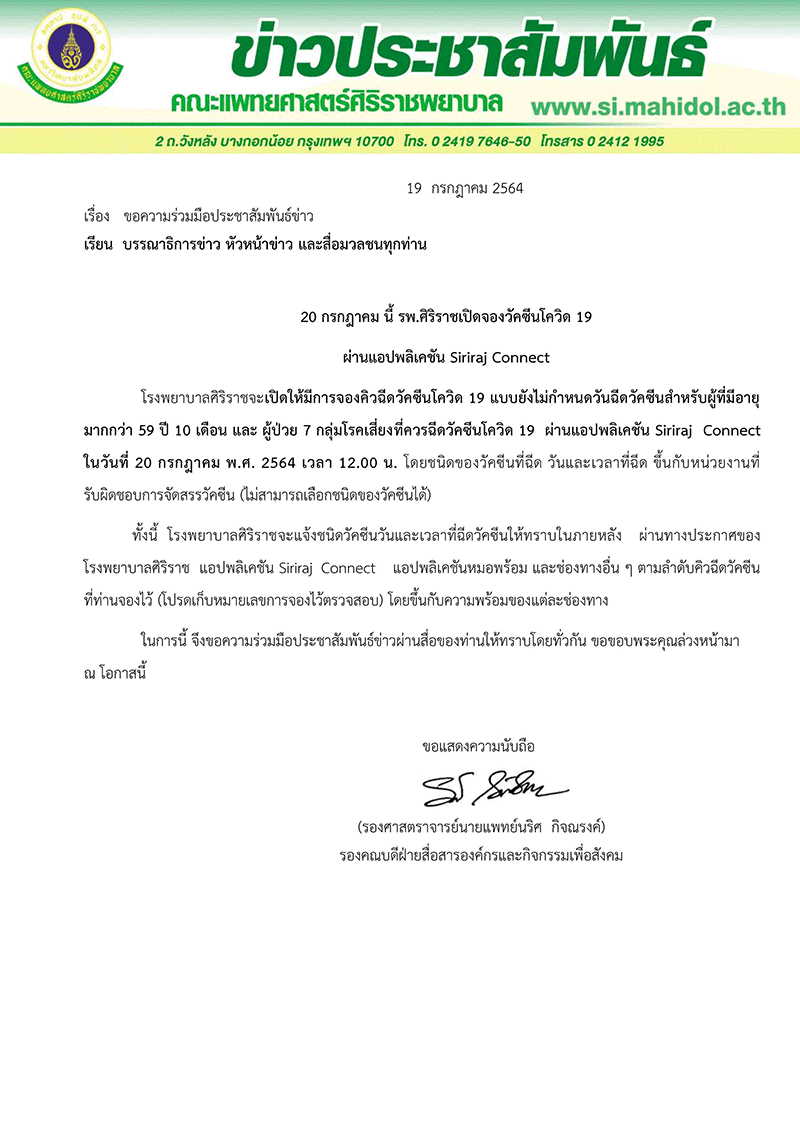 20 ก.ค. นี้ รพ.ศิริราชเปิดจองวัคซีนโควิด-19 ผ่านแอปพลิเคชัน Siriraj Connect