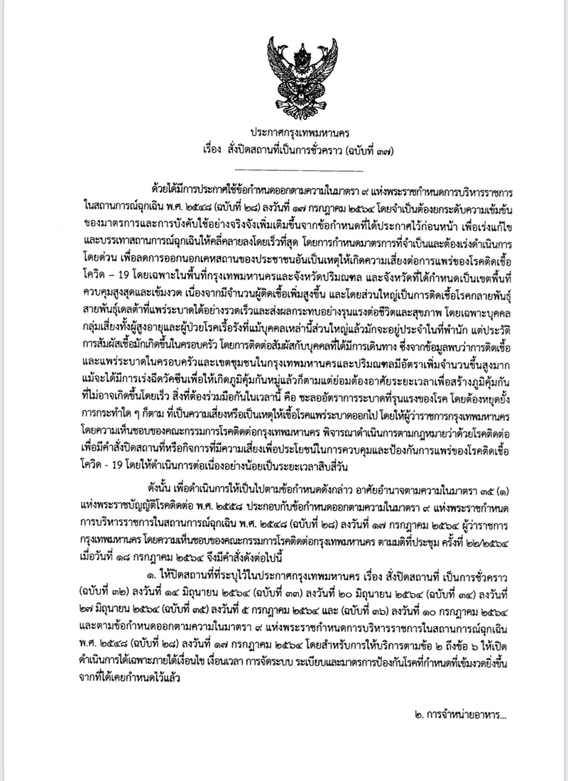 โดยระบุ เพื่อเร่งแก้ไขและบรรเทาสถานการณ์ฉุกเฉินให้คลี่คลายลงโดยเร็วที่สุด เนื้อหาสำคัญดังต่อไปนี้ 1.ปิดสถานที่ต่อตามประกาศเดิม ที่ระบุไว้ในประกาศกรุงเทพมหานคร เรื่อง สั่งปิดสถานที่เป็นการชั่วคราว ฉบับที่ 32, 33, 34, 35 และ 36 โดยให้ปฏิบัติตามข้อกำหนดตามความมาตรา 9 แห่งพรก.การบริหารราชการในสถานการณ์ฉุกเฉิน พ.ศ.2548 ฉบับที่ 28