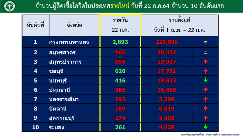 ศูนย์บริหารสถานการณ์โควิด-19 หรือ ศบค. เผยตัวเลขสถานการณ์ ประจำวันพฤหัสบดี ที่ 22 กรกฎาคม 2564 ประเทศไทยอยู่ในอันดับที่ 50 ของโลก พบผู้ติดเชื้อรายใหม่รวม 13,655 ราย