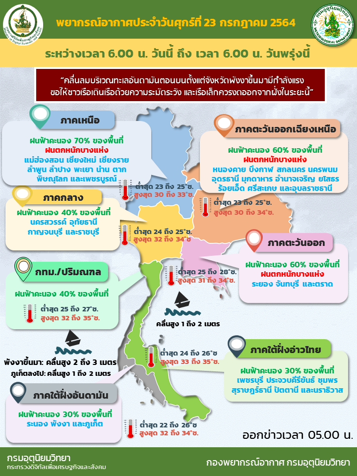กรมอุตุนิยมวิทยา รายงาน ลักษณะอากาศทั่วไป พยากรณ์อากาศ 24 ชั่วโมงข้างหน้า ร่องมรสุมพาดผ่านประเทศเมียนมา ตอนบนของภาคเหนือ และประเทศเวียดนามตอนบน ประกอบกับ มรสุมตะวันตกเฉียงใต้ที่พัดปกคลุมทะเลอันดามัน ประเทศไทย และอ่าวไทยมีกำลังแรง ลักษณะเช่นนี้ทำให้ภาคเหนือตอนบน ภาคตะวันออกเฉียงเหนือและภาคตะวันออก มีฝนตกหนักบางแห่ง ขอให้ประชาชนบริเวณดังกล่าวระวังอันตรายจากฝนที่ตกหนักและฝนที่ตกสะสม ซึ่งอาจทำให้เกิดน้ำท่วมฉับพลัน น้ำป่าไหลหลากได้ สำหรับคลื่นลมบริเวณทะเลอันดามันตอนบนตั้งแต่จังหวัดพังงาขึ้นมามีกำลังแรง โดยมีคลื่นสูง 2-3 เมตร บริเวณที่มีฝนฟ้าคะนองคลื่นสูงมากกว่า 3 เมตร ขอให้ชาวเรือเดินเรือด้วยความระมัดระวัง และเรือเล็กควรงดออกจากฝั่งในระยะนี้