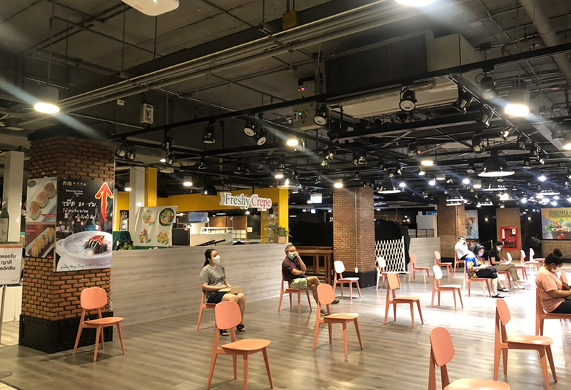ซึ่งในวันนี้ทางห้าง มีการจัดสรรที่นั่งรอให้กับญาติผู้ที่มาฉีดวัคซีนด้วย จากเดิมที่ไม่ได้มีการจัดที่นั่งให้กับญาติผู้เข้ารับการฉีดวัคซีน