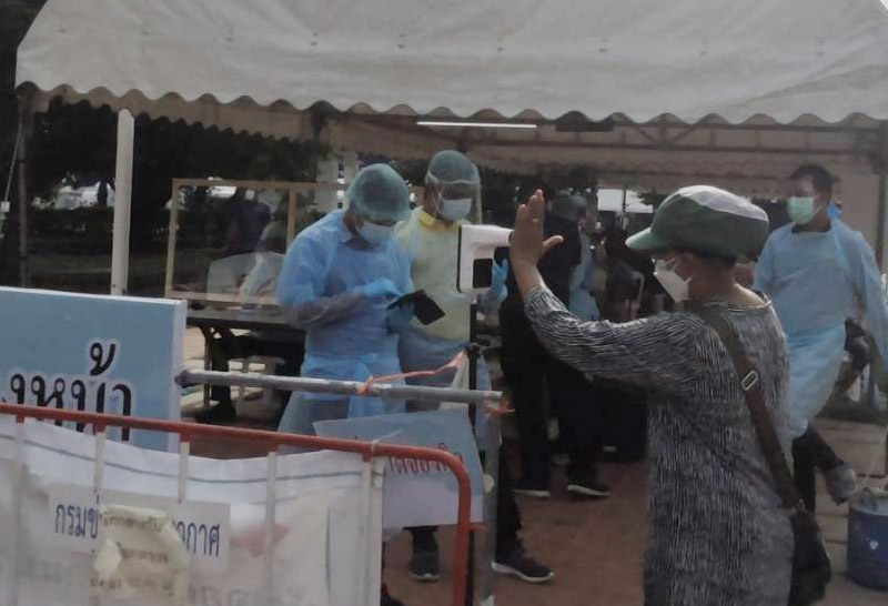 บรรยากาศจุดคัดกรอง บริเวณ สนามกีฬากองทัพอากาศธูปะเตมีย์ มีประชาชนที่จองคิวตรวจเชื้อโควิด-19 ผ่านแอปพลิเคชันคิวๆ เดินทางมาเพื่อรอรับการตรวจตั้งแต่เช้า โดยประชาชนต้องเดินทางมาก่อนช่วงเวลาที่จองไว้ 15 นาที ซึ่งถ้ามาไม่ทันเวลาจะถูกตัดสิทธิ์ สำหรับสิ่งที่ต้องนำมาด้วยคือหลักฐานการจองคิวในโทรศัพท์ พร้อมบัตรประชาชนตัวจริงสำเนาบัตรประชาชน และปากกาส่วนตัวเพื่อใช้กรอกข้อมูล