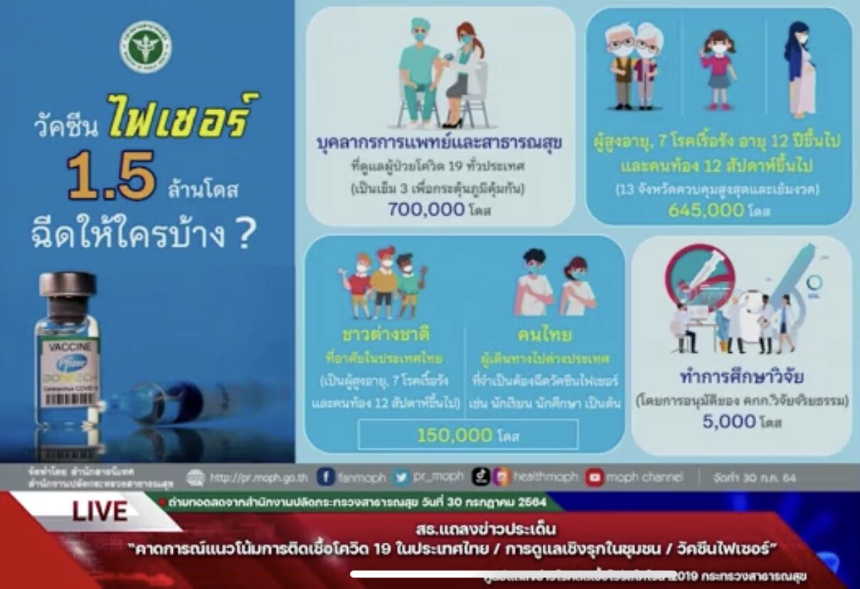 3.ชาวต่างชาติที่อาศัยอยู่ในประเทศไทย (ผู้สูงอายุ, 7 โรคเรื้อรังอายุ 12 ปีขึ้นไปและคนท้อง 12 สัปดาห์ขึ้นไป) รวมถึง คนไทยที่ต้องเดินทางไปต่างประเทศที่จำเป็นต้องฉีดวัคซีนไฟเซอร์ เช่น นักเรียน นักศึกษา เป็นต้น จำนวน 150,000 โดส และ