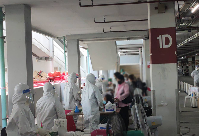 บรรยากาศ ที่ลานจอดรถชั้น 1 อาคารบี ศูนย์ราชการเฉลิมพระเกียรติ ถ.แจ้งวัฒนะ ที่ได้ประกาศ ขยายวันการให้บริการตรวจโควิด-19 เชิงรุกฟรี ในวันที่ 2-3 สิงหาคม ซึ่งผู้ที่เดินทางมาตรวจเชื้อโควิด-19 พบว่ามีประชาชนทุกเพศทุกวัยที่เดินทางมาตรวจหาเชื้อ โควิด-19 จนล้นลานจอดรถออกไปบริเวณด้านนอก โดยกลุ่มที่เป็นผู้สูงอายุ คนพิการ คนที่ต้องการความช่วยเหลือเป็นพิเศษ จะได้รับการตรวจก่อน ซึ่งบางคนมารอเข้ารับการตรวจเชื้อตั้งแต่เวลา 04.00 น. นอกจากนี้ ยังมีผู้ที่มารับยาฟาวิพิราเวียร์ให้กับผู้ป่วยด้วย