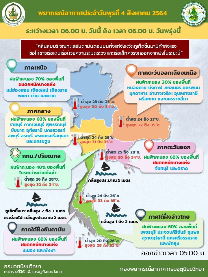 กรมอุตุนิยมวิทยารายงาน ลักษณะอากาศทั่วไป พยากรณ์อากาศ 24 ชั่วโมงข้างหน้า มรสุมตะวันตกเฉียงใต้กำลังค่อนข้างแรงพัดปกคลุมทะเลอันดามัน ประเทศไทย และอ่าวไทย ประกอบกับร่องมรสุมพาดผ่านประเทศเมียนมา ลาว และเวียดนามตอนบน เข้าสู่พายุดีเปรสชันบริเวณชายฝั่งประเทศจีนตอนใต้ ลักษณะเช่นนี้ทำให้ภาคเหนือ ภาคตะวันออก และภาคใต้ฝั่งตะวันตก มีฝนตกหนักบางแห่ง ขอให้ประชาชนบริเวณดังกล่าวระวังอันตรายจากฝนตกหนักและฝนที่ตกสะสม ซึ่งอาจทำให้เกิดน้ำท่วมฉับพลัน และน้ำป่าไหลหลากได้