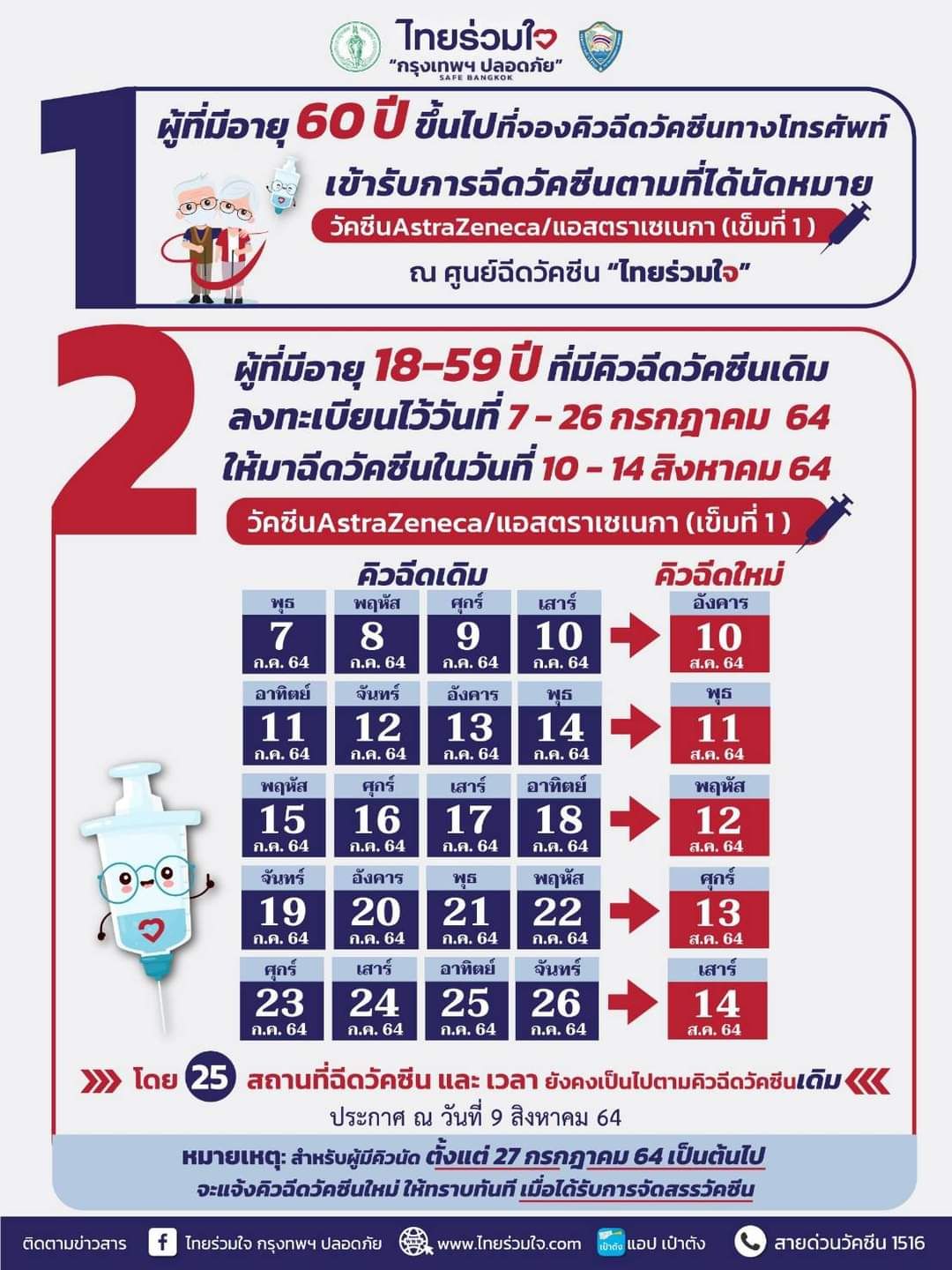 วันที่ 9 สิงหาคม 2564 กรุงเทพมหานคร (กทม.) แจ้งผ่านเฟซบุ๊กว่า ไทยร่วมใจฯ แจ้งให้ผู้สูงอายุ 60 ปี ที่จองคิวฉีดวัคซีนทางโทรศัพท์ เข้ารับการฉีดวัคซีนตามที่ได้นัดหมาย พร้อมแจ้งคิวฉีดใหม่ ผู้ที่ถูกเลื่อนตั้งแต่ 7-26 ก.ค. 64 มาเป็น 10-14 ส.ค. 64