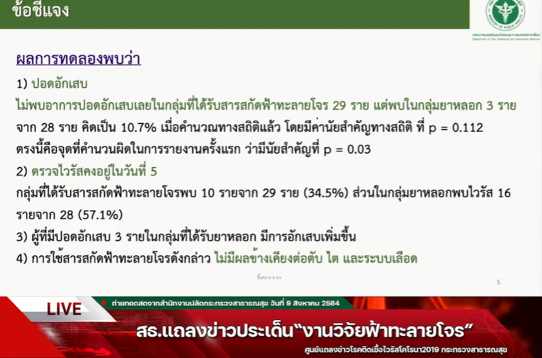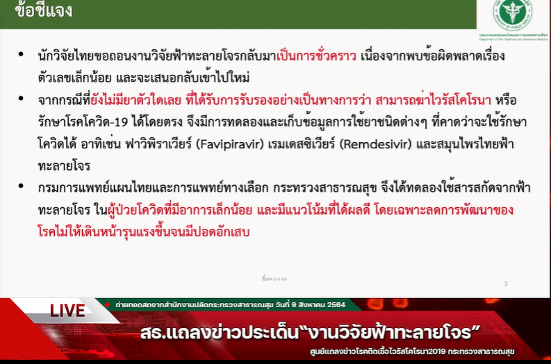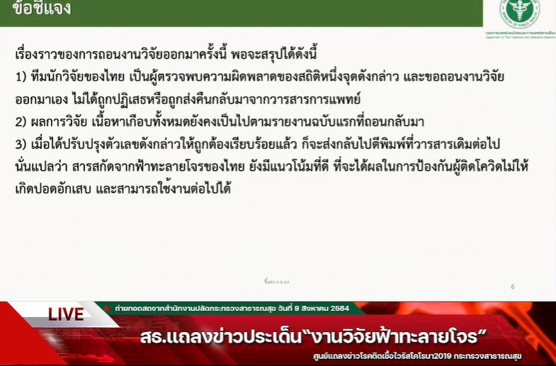 อธิบดีกรมการแพทย์แผนไทยและการแพทย์ทางเลือก เผยสาเหตุขอถอนงานวิจัยฟ้าทะลายโจรเพราะตัวเลขคลาดเคลื่อน ยันฟ้าทะลายโจรใช้รักษาผู้ป่วยโควิดอาการเล็กน้อยดีได้และไม่มีผลข้างเคียงต่อตับ ไต และระบบเลือด