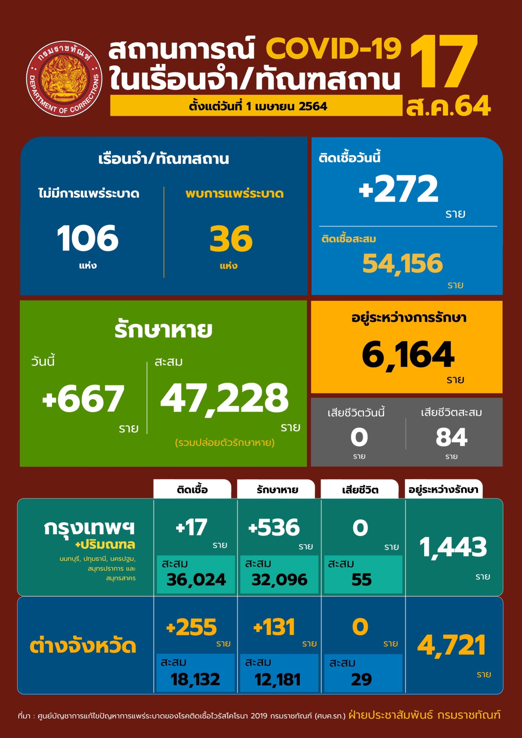 นายอายุตม์ สินธพพันธุ์ อธิบดีกรมราชทัณฑ์ เปิดเผยถึงสถานการณ์การแพร่ระบาดของโรคติดเชื้อไวรัสโควิด-19 ในเรือนจำและทัณฑสถาน (ข้อมูล ณ วันที่ 16 สิงหาคม 2564 เวลา 16.00 นาฬิกา) พบผู้ติดเชื้อรายใหม่ 272 ราย พบในเรือนจำสีแดง 251 ราย และพบในห้องแยกกักโรคผู้ต้องขังรับใหม่ 21 ราย รักษาหายเพิ่ม 667 ราย ไม่มีรายงานผู้เสียชีวิตในวันนี้ต่อเนื่องเป็นวันที่ 3 ทำให้มีผู้ติดเชื้อที่ยังอยู่ในการดูแลของกรมราชทัณฑ์ 6,164 ราย (กลุ่มสีเขียว 88.9% สีเหลือง 10.6% และสีแดง 0.5%) เป็นพื้นที่กรุงเทพมหานคร 190 ราย ปริมณฑล 1,253 ราย และต่างจังหวัด 4,721 ราย