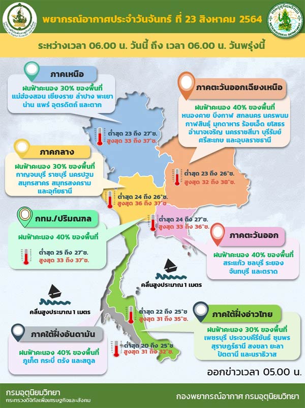 อนึ่ง ในช่วงวันที่ 25 – 29 ส.ค. 64 จะมีร่องมรสุมเลื่อนลงมาพาดผ่านภาคเหนือ ภาคกลาง และภาคตะวันออกเฉียงเหนือ ทำให้บริเวณประเทศไทยตอนบนมีฝนเพิ่มขึ้นและมีฝนตกหนักถึงหนักมากบางแห่ง ขอให้ประชาชนบริเวณพื้นที่เสี่ยงภัยระวังอันตรายจากฝนตกหนักและฝนที่ตกสะสม ซึ่งอาจทำให้เกิดน้ำท่วมฉับพลัน น้ำป่าไหลหลากไว้ด้วย