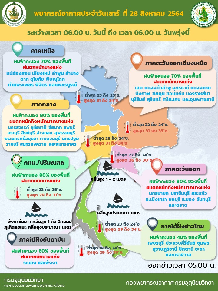 พยากรณ์อากาศ 24 ชั่วโมงข้างหน้า ประเทศไทยยังคงมีฝนตกต่อเนื่องกับมีฝนตกหนักหลายพื้นที่ และมีฝนตกหนักมากบางแห่งบริเวณภาคกลางและภาคตะวันออก เนื่องจากร่องมรสุมพาดผ่านภาคเหนือตอนล่าง ภาคกลาง ภาคตะวันออก และภาคตะวันออกเฉียงเหนือตอนล่าง เข้าสู่หย่อมความกดอากาศต่ำบริเวณทะเลจีนใต้ตอนล่าง ประกอบกับมรสุมตะวันตกเฉียงใต้ที่พัดปกคลุมทะเลอันดามัน ประเทศไทย และอ่าวไทยมีกำลังปานกลาง ขอให้ประชาชนที่อาศัยในพื้นที่เสี่ยงภัยบริเวณภาคเหนือ ภาคตะวันออกเฉียงเหนือ ภาคกลาง ภาคตะวันออก และภาคใต้ฝั่งตะวันตก ระวังอันตรายจากฝนตกหนักและฝนที่ตกสะสม ซึ่งอาจทำให้เกิดน้ำท่วมฉับพลันและน้ำป่าไหลหลากในระยะนี้ไว้ด้วย