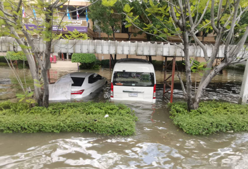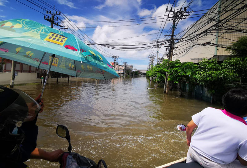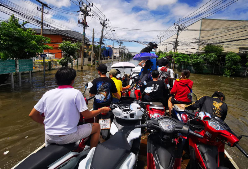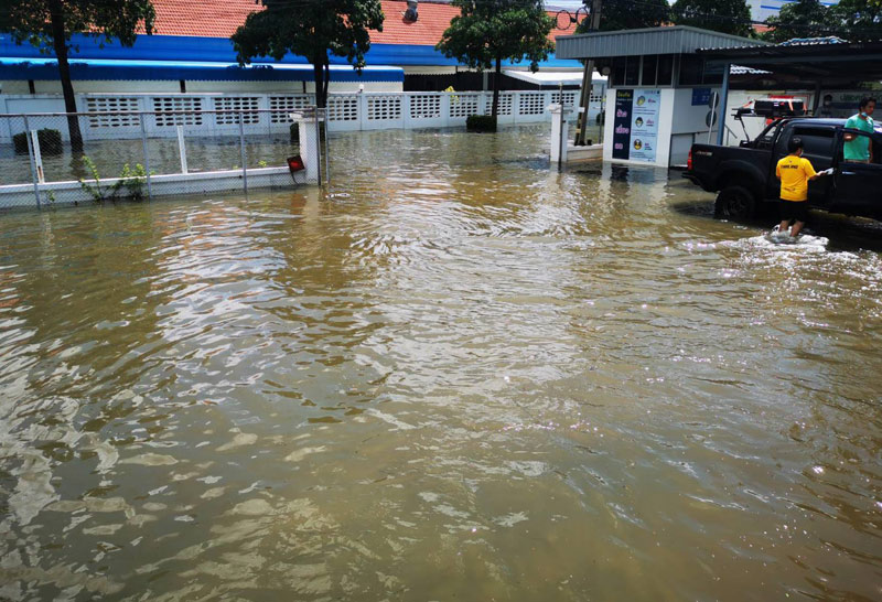 บรรยากาศภายในเขตนิคมอุตสาหกรรมบางปู จ.สมุทรปราการ หลังเกิดฝนตกหนักเป็นเวลาหลายชั่วโมงส่งผลให้น้ำท่วมขังภายในนิคมอุตสาหกรรมอย่างหนักทางตั้งแต่เมื่อวานที่ผ่านมา จากการสำรวจพบว่าในช่วงเช้าวันนี้ระดับน้ำได้ลดระดับลงไปมาก แต่บางจุดยังคงท่วมสูงอยู่โดยเฉพาะทางเข้านิคมอุตสาหกรรมที่เมื่อวานระดับน้ำสูงเกือบถึงเอว แต่เช้านี้ระดับน้ำลดลง ทำให้มีพนักงานของบริษัทที่ตั้งอยู่ภายในนิคมเดินทางกันมาเพื่อรอขึ้นรถของเจ้าหน้าที่ทหารจากกองทัพเพื่อประชาชนตลอดจนรถบรรทุกเครนขนาดเล็กของโรงงานและรถออฟโรดของจิตอาสา เพื่อเข้าไปเก็บสิ่งของต่างๆ และนำรถจักรยานยนต์ที่ต้องจอดทิ้งไว้ภายในโรงงานออกมา เพื่อป้องกันไม่ให้เกิดความเสียหายโดยพบว่ารถส่วนใหญ่จมอยู่ใต้น้ำและสตาร์ทไม่ติดแล้วต้องนำออกไปซ่อมร้านข้างนอก