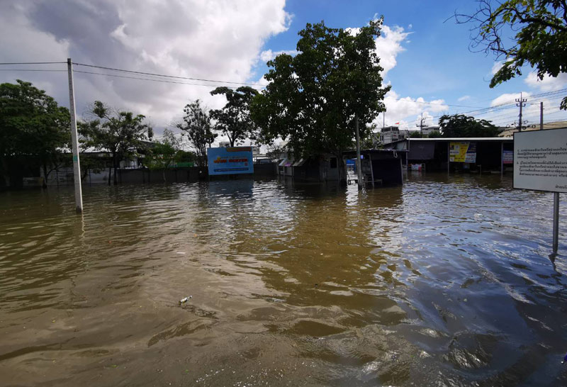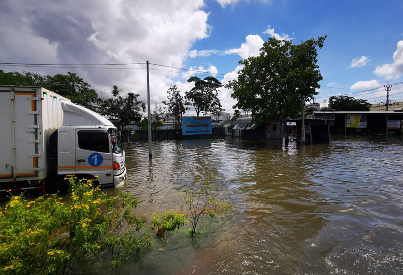 บรรยากาศภายในเขตนิคมอุตสาหกรรมบางปู จ.สมุทรปราการ หลังเกิดฝนตกหนักเป็นเวลาหลายชั่วโมงส่งผลให้น้ำท่วมขังภายในนิคมอุตสาหกรรมอย่างหนักทางตั้งแต่เมื่อวานที่ผ่านมา จากการสำรวจพบว่าในช่วงเช้าวันนี้ระดับน้ำได้ลดระดับลงไปมาก แต่บางจุดยังคงท่วมสูงอยู่โดยเฉพาะทางเข้านิคมอุตสาหกรรมที่เมื่อวานระดับน้ำสูงเกือบถึงเอว แต่เช้านี้ระดับน้ำลดลง ทำให้มีพนักงานของบริษัทที่ตั้งอยู่ภายในนิคมเดินทางกันมาเพื่อรอขึ้นรถของเจ้าหน้าที่ทหารจากกองทัพเพื่อประชาชนตลอดจนรถบรรทุกเครนขนาดเล็กของโรงงานและรถออฟโรดของจิตอาสา เพื่อเข้าไปเก็บสิ่งของต่างๆ และนำรถจักรยานยนต์ที่ต้องจอดทิ้งไว้ภายในโรงงานออกมา เพื่อป้องกันไม่ให้เกิดความเสียหายโดยพบว่ารถส่วนใหญ่จมอยู่ใต้น้ำและสตาร์ทไม่ติดแล้วต้องนำออกไปซ่อมร้านข้างนอก
