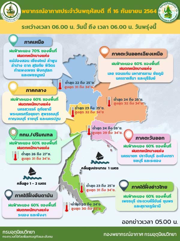 พยากรณ์อากาศ 24 ชั่วโมงข้างหน้า ร่องมรสุมพาดผ่านภาคเหนือตอนล่าง ภาคกลาง และภาคตะวันออกเฉียงเหนือตอนล่าง ประกอบกับมรสุมตะวันตกเฉียงใต้ที่พัดปกคลุมทะเลอันดามัน ภาคใต้ และอ่าวไทยมีกำลังปานกลาง ลักษณะเช่นนี้ทำให้ประเทศไทยมีฝนตกต่อเนื่องโดยมีฝนตกหนักบางแห่งบริเวณภาคเหนือ ภาคตะวันออกเฉียงเหนือ ภาคกลาง ภาคตะวันออก และภาคใต้ฝั่งตะวันตก ขอให้ประชาชนที่อาศัยอยู่ในพื้นที่เสี่ยงภัยบริเวณดังกล่าว ระวังอันตรายจากฝนตกหนักและฝนที่ตกสะสมซึ่งอาจทำให้เกิดน้ำท่วมฉับพลัน และน้ำป่าไหลหลากไว้ด้วย