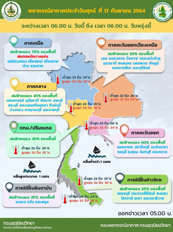 พยากรณ์อากาศ 24 ชั่วโมงข้างหน้า ร่องมรสุมพาดผ่านภาคเหนือ และภาคตะวันออกเฉียงเหนือตอนบน ประกอบกับมรสุมตะวันตกเฉียงใต้ที่พัดปกคลุมทะเลอันดามัน ภาคใต้ และอ่าวไทยมีกำลังอ่อนลง ลักษณะเช่นนี้ทำให้บริเวณประเทศไทยมีฝนลดลง แต่ยังคงมีฝนฟ้าคะนองเกิดขึ้นได้บางพื้นที่ โดยมีฝนตกหนักบางแห่งในภาคเหนือ สำหรับคลื่นลมบริเวณทะเลอันดามันและอ่าวไทยมีกำลังอ่อนลง โดยทะเลอันดามันมีคลื่นสูงประมาณ 1 เมตร และอ่าวไทยมีคลื่นต่ำกว่า 1 เมตร