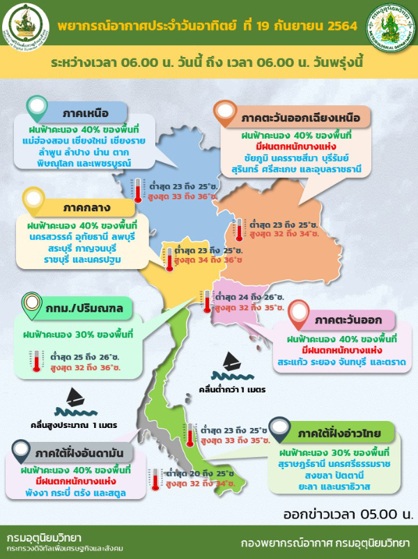 พยากรณ์อากาศ 24 ชั่วโมงข้างหน้า มรสุมตะวันตกเฉียงใต้กำลังอ่อนพัดปกคลุมทะเลอันดามัน ภาคใต้ และอ่าวไทย ลักษณะเช่นนี้ทำให้ประเทศไทยมีฝนฟ้าคะนองเกิดขึ้น โดยมีฝนตกหนักบางแห่งในภาคตะวันออกเฉียงเหนือ ภาคตะวันออก และภาคใต้ฝั่งตะวันตก สำหรับคลื่นลมบริเวณทะเลอันดามันและอ่าวไทยมีกำลังอ่อนลง โดยทะเลอันดามันมีคลื่นสูงประมาณ 1 เมตร และอ่าวไทยมีคลื่นต่ำกว่า 1 เมตร ส่วนบริเวณที่มีฝนฟ้าคะนองคลื่นสูง 1-2 เมตร ขอให้ชาวเรือเดินเรือด้วยความระมัดระวัง และหลีกเลี่ยงการเดินเรือบริเวณที่มีฝนฟ้าคะนองไว้ด้วย