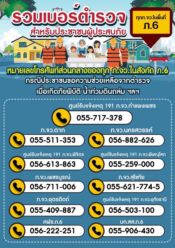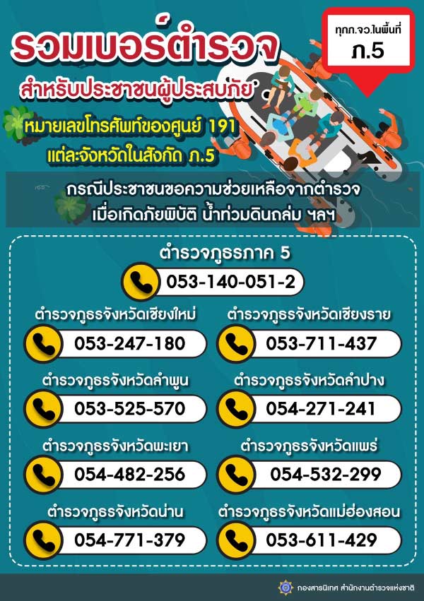 จากสถานการณ์ที่ในขณะนี้หลายภูมิภาคในประเทศกำลังประสบปัญหาฝนตกหนัก จนเกิดน้ำท่วมในหลายพื้นที่ สำนักงานตำรวจแห่งชาติจึงรวบรวมเบอร์โทรตำรวจทุกจังหวัดในพื้นที่ ภาค5 และ 6 ไว้ให้สำหรับประชาชนผู้ประสบภัยได้โทรติดต่อขอความช่วยเหลือ เนื่องจากในขณะนี้ 2พื้นที่ดังกล่าวถือเป็นพื้นที่ที่กำลังเผชิญกับภัยพิบัติน้ำท่วม ดินถล่มรุนแรงมากทุกสุดและมีประชาชนในหลายหมู่บ้าน หลายพื้นที่ต้องการความช่วยเหลือ