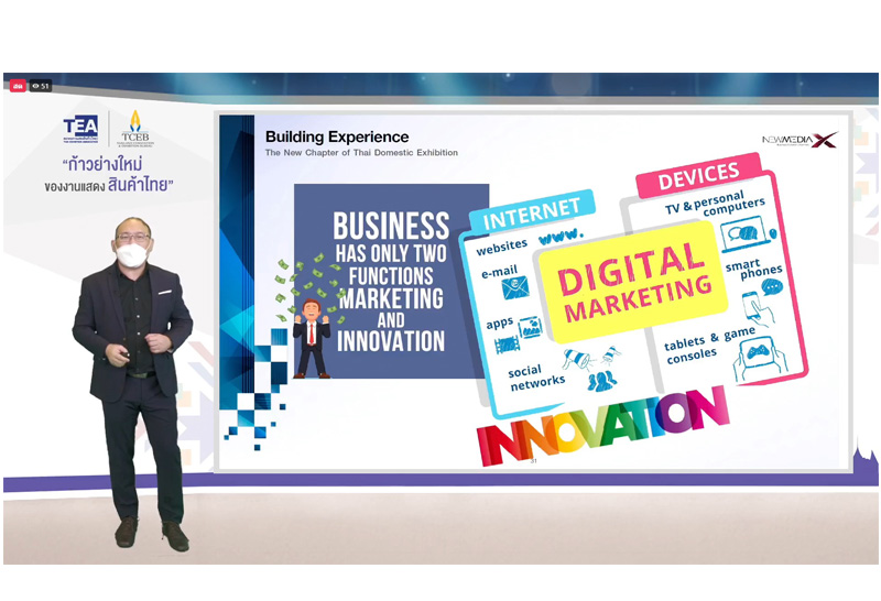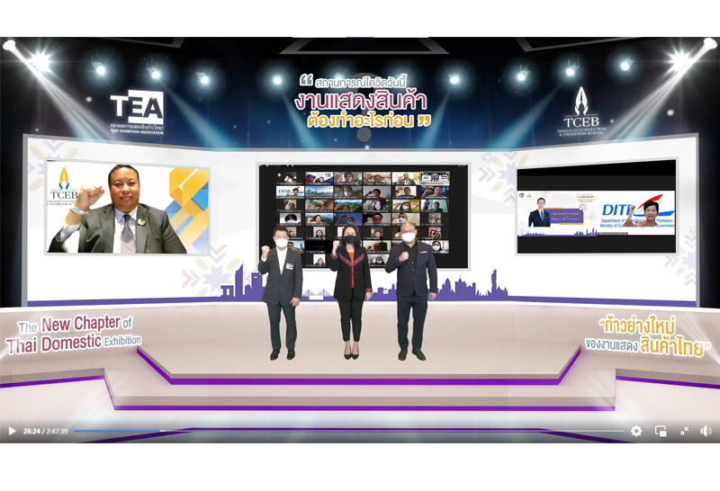 29 กันยายน 2564 กรุงเทพฯ: ทีเส็บ เปิดแผนขับเคลื่อนงานแสดงสินค้าในประเทศ จับมือสมาคมการแสดงสินค้า (ไทย) TEA และเครือข่ายพันธมิตรด้านไมซ์ ร่วมส่งเสริมการตลาดจัดงานเสวนาออนไลน์ 3 ภูมิภาค เผยกลยุทธ์ขับเคลื่อนอุตสาหกรรมงานแสดงสินค้าในประเทศยุควิถีใหม่ เชื่อมโยงเมืองไมซ์ ดันการจัดงานแสดงสินค้ากระตุ้นเศรษฐกิจและกระจายรายได้สู่ภูมิภาค