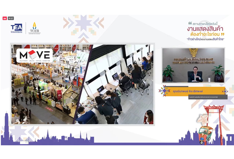 เพื่อร่วมบูรณาการขับเคลื่อนการจัดงานแสดงสินค้าในประเทศยุควิถีใหม่ ทีเส็บจึงร่วมกับสมาคมการแสดงสินค้า (ไทย) หรือ TEA จัดงานเสวนาออนไลน์ “สถานการณ์โควิดวันนี้ งานแสดงสินค้าต้องทำอะไรก่อน” ใน 3 ภูมิภาค คือ กรุงเทพฯ เชียงใหม่ และสงขลา โดยครั้งที่ 1 จัดขึ้นที่กรุงเทพฯ วันที่ 29 กันยายน 2564 ในหัวข้อ “ก้าวย่างใหม่ของงานแสดงสินค้าไทย” ดำเนินการร่วมกับองค์กรพันธมิตรด้านไมซ์นำเสนอมุมมองการส่งเสริมอุตสาหกรรมงานแสดงสินค้าในประเทศยุควิถีใหม่ พร้อมทั้งกลยุทธ์การขับเคลื่อนเศรษฐกิจไทยด้วยงานแสดงสินค้าในปี 2565 ให้แก่หน่วยงานภาครัฐ เอกชน และผู้ประกอบการไมซ์ ซึ่งมีผู้ลงทะเบียนเข้าร่วมฟังเสวนากว่า 500 คน