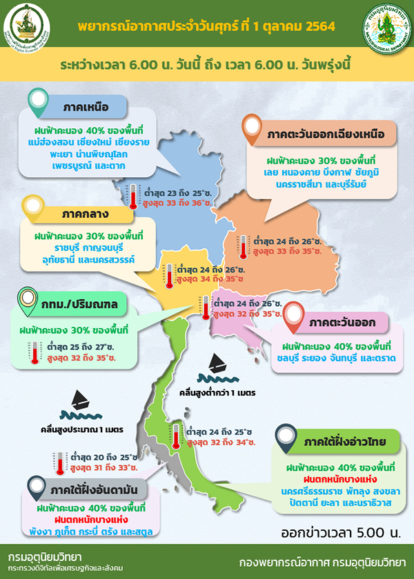 พยากรณ์อากาศ 24 ชั่วโมงข้างหน้า มรสุมตะวันตกเฉียงใต้ที่พัดปกคลุมทะเลอันดามัน ประเทศไทย และอ่าวไทยเริ่มมีกำลังแรงขึ้น ลักษณะเช่นนี้ทำให้ประเทศไทยมีฝนฟ้าคะนองเกิดขึ้น โดยมีฝนตกหนักบางแห่งในภาคใต้ ในช่วงของฤดูฝนการสะสมของฝุ่นละออง/หมอกควันมีน้อย