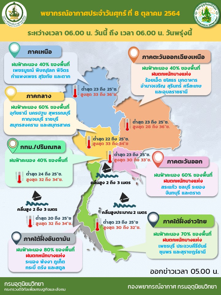 สำหรับคลื่นลมบริเวณทะเลอันดามันและอ่าวไทยตอนบนมีกำลังแรง โดยคลื่นสูง 2-3 เมตร ส่วนอ่าวไทยตอนล่างคลื่นสูงประมาณ 2 เมตร บริเวณที่มีฝนฟ้าคะนองคลื่นสูงมากกว่า 3 เมตร ขอให้ชาวเรือบริเวณทะเลอันดามันและอ่าวไทยควรเพิ่มความระมัดระวังในการเดินเรือและหลีกเลี่ยงบริเวณที่มีฝนฟ้าคะนอง ส่วนเรือเล็กบริเวณทะเลอันดามันและอ่าวไทยตอนบนควรงดออกจากฝั่งในระยะนี้ทั้งนี้เนื่องจาก ร่องมรสุมพาดผ่านภาคกลาง และภาคตะวันออกเฉียงเหนือตอนล่าง ประกอบกับมรสุมตะวันตกเฉียงใต้ที่พัดปกคลุมทะเลอันดามัน ภาคใต้ และอ่าวไทยมีกำลังแรงขึ้นอนึ่ง พายุดีเปรสชันบริเวณทะเลจีนใต้ตอนบนได้ทวีกำลังแรงขึ้นเป็นพายุโซนร้อน “ไลออนร็อก” แล้ว คาดว่าเคลื่อนขึ้นฝั่งประเทศเวียดนามตอนบนในช่วงวันที่ 10-11 ตุลาคม 2564