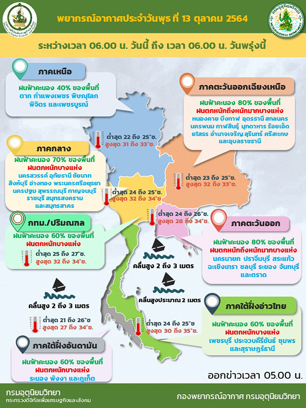 เตือน! ประชาชนตะวันออกเฉียงเหนือ กลาง ใต้ มีฝนตกหนักอาจทำให้เกิดน้ำท่วมฉับพลันและน้ำป่าไหลหลากพยากรณ์อากาศ 24 ชั่วโมงข้างหน้า ร่องมรสุมพาดผ่านภาคกลางตอนล่าง ภาคตะวันออก และภาคตะวันออกเฉียงเหนือตอนล่าง เข้าสู่พายุโซนร้อนกำลังแรง “คมปาซุ” บริเวณทะเลจีนใต้ตอนบน ในขณะที่มรสุมตะวันตกเฉียงใต้กำลังแรงพัดปกคลุมทะเลอันดามัน ภาคใต้ และอ่าวไทย ลักษณะเช่นนี้ทำให้มีฝนตกหนักมากบางแห่งในภาคตะวันออกเฉียงเหนือตอนบน และภาคตะวันออ ก และมีฝนตกหนักบางแห่งในภาคตะวันออกเฉียงเหนือตอนล่าง ภาคกลาง และภาคใต้ ขอให้ประชาชนในพื้นที่เสี่ยงภัยบริเวณดังกล่าว ระวังอันตรายจากฝนตกหนักและฝนที่ตกสะสมซึ่งอาจทำให้เกิดน้ำท่วมฉับพลันและน้ำป่าไหลหลากในระยะนี้ไว้ด้วย สำหรับคลื่นลมบริเวณทะเลอันดามันและอ่าวไทยตอนบนมีกำลังแรง โดยทะเลอันดามันและอ่าวไทยตอนบนมีคลื่นสูง 2-3 เมตร ส่วนอ่าวไทยตอนล่างมีคลื่นสูง ประมาณ 2 เมตร และบริเวณที่มีฝนฟ้าคะนองคลื่นสูงมากกว่า 3 เมตร ขอให้ชาวเรือบริเวณทะเลอันดามันและอ่าวไทยเพิ่มความระมัดระวังในการเดินเรือและหลีกเลี่ยงบริเวณที่มีฝนฟ้าคะนอง ส่วนเรือเล็กบริเวณทะเลอันดามันและอ่าวไทยตอนบนควรงดออกจากฝั่งในระยะนี้ ในส่วนของกรุงเทพมหานครและปริมณฑลมีฝนฟ้าคะนองร้อยละ 60 ของพื้นที่ กับมีฝนตกหนักบางแห่ง อุณหภูมิต่ำสุด 25-27 องศาเซลเซียส อุณหภูมิสูงสุด 32-34 องศาเซลเซียส ลมตะวันตกเฉียงใต้ ความเร็ว 10-20 กม./ชม.