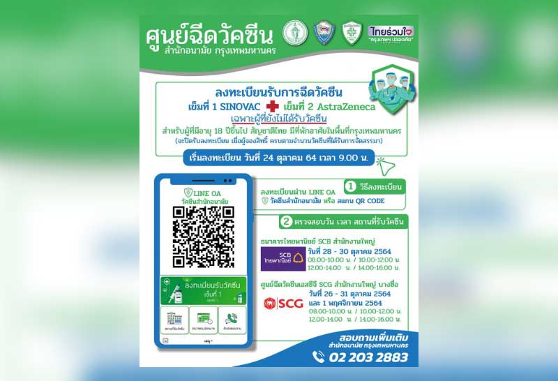 วันนี้ (24 ต.ค. 64) ศูนย์ฉีดวัคซีน สำนักอนามัย กรุงเทพมหานคร เปิดให้ประชาชนอายุ 18 ปีขึ้นไป สัญชาติไทย พักอาศัยในกรุงเทพมหานคร ที่ยังไม่เคยได้รับวัคซีน ลงทะเบียนรับการฉีดวัคซีน เข็มที่ 1 SINOVAC และเข็มที่ 2 AstraZeneca ผ่านระบบ LINE OA วัคซีนสำนักอนามัย วันนี้ (24 ต.ค.) เป็นวันแรก โดยจะทำการปิดรับลงทะเบียนเมื่อผู้ลงทะเบียนครบตามจำนวนวัคซีนที่ได้รับการจัดสรรมา