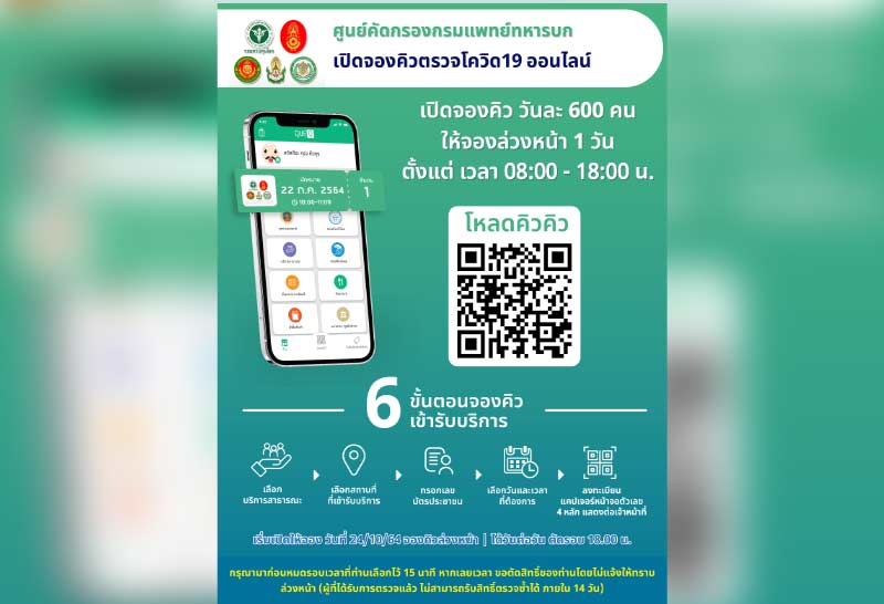 เพื่อให้สอดคล้องกับการปฏิบัติงานของบุคลากรทางการแพทย์ และเพื่ออำนวยความสะดวกในการให้บริการอย่างครบวงจร ตั้งแต่ 25 ต.ค.ที่ผ่านมา ให้บริการประชาชนทั่วไป วันละ 500 คน ผู้ที่สนใจสามารถลงทะเบียนนัดหมายล่วงหน้า 1 วัน ผ่านทางแอปพลิเคชัน QueQ