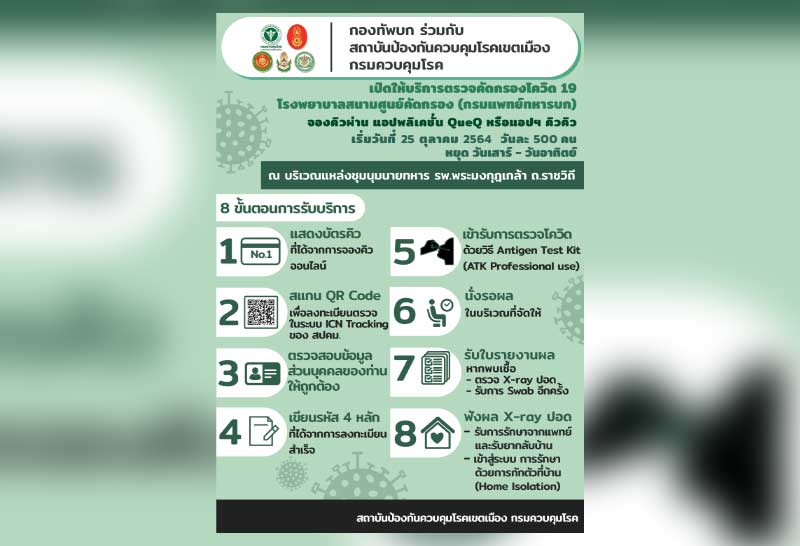 พร้อมกันนี้ ได้จัดตั้งโรงพยาบาลสนามศูนย์คัดกรองกองทัพบกใน 3 พื้นที่ ได้แก่ โรงพยาบาลสนามศูนย์คัดกรอง (กรมการทหารช่าง), โรงพยาบาลสนามศูนย์คัดกรอง (มณฑลทหารบกที่ 11) และ โรงพยาบาลสนามศูนย์คัดกรอง (สโมสรทหารบก) ถ.วิภาวดี ซึ่งเปิดดำเนินการ ตั้งแต่ 2 ส.ค. 64 ให้บริการตรวจคัดกรองหาเชื้อโควิด-19 ให้กับประชาชน รวม 42,793 ราย จนเมื่อสถานการณ์ในปัจจุบันมีแนวโน้มที่ดีขึ้น