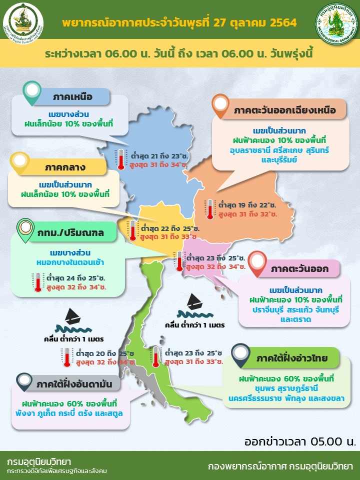 อนึ่ง เมื่อเวลา 04.00 น. หย่อมความกดอากาศต่ำกำลังแรงบริเวณทะเลจีนใต้ตอนกลาง ได้เคลื่อนขึ้นฝั่งประเทศเวียดนามตอนล่างแล้ว คาดว่าจะเข้าปกคลุมประเทศกัมพูชาในวันนี้(27 ตุลาคม 2564) โดยมีแนวโน้มอ่อนกำลังลง ลักษณะเช่นนี้ส่งผลให้ในช่วงวันที่ 27 -29 ตุลาคม 2564 ประเทศไทยตอนบนมีฝนเพิ่มมากขึ้น ส่วนพายุโซนร้อน “หมาเหล่า” ที่ปกคลุมมหาสมุทรแปซิฟิก ไม่มีผลกระทบต่อลักษณะอากาศของประเทศไทย