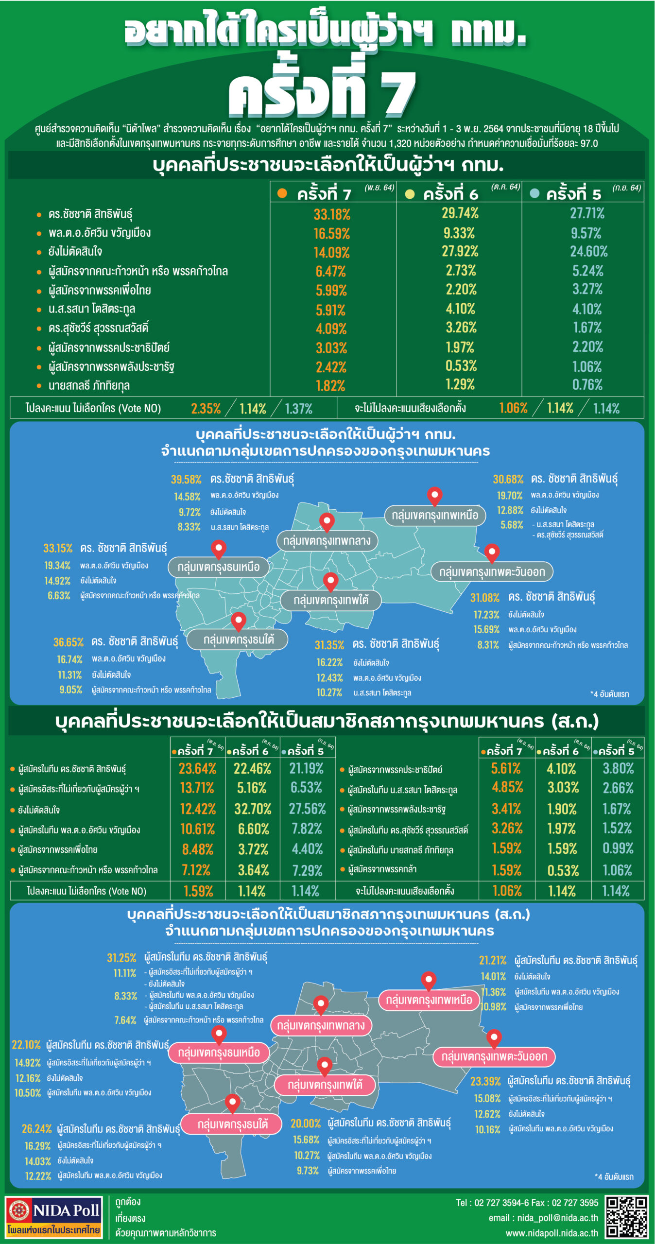 “นิด้าโพล” สถาบันบัณฑิตพัฒนบริหารศาสตร์ (นิด้า) เปิดเผยผลสำรวจของประชาชน อายุ 18 ปีขึ้นไป และมีสิทธิเลือกตั้งในกรุงเทพมหานคร รวมทั้งสิ้น จำนวน 1,320 หน่วยตัวอย่างเรื่อง “อยากได้ใคร เป็นผู้ว่าฯ กทม. ครั้งที่ 7”เมื่อถามถึงบุคคลที่ประชาชนจะเลือกให้เป็นผู้ว่าฯ กทม. พบว่า ร้อยละ 33.18 ระบุว่าเป็น ดร.ชัชชาติ สิทธิพันธุ์ รองลงมาร้อยละ 16.59 ระบุว่าเป็น พล.ต.อ.อัศวิน ขวัญเมือง อันดับ 3 ร้อยละ 14.09 ระบุว่า ยังไม่ตัดสินใจ อันดับ 4 ร้อยละ 6.74 ระบุว่าเป็น ผู้สมัครจากคณะก้าวหน้า หรือพรรคก้าวไกล
