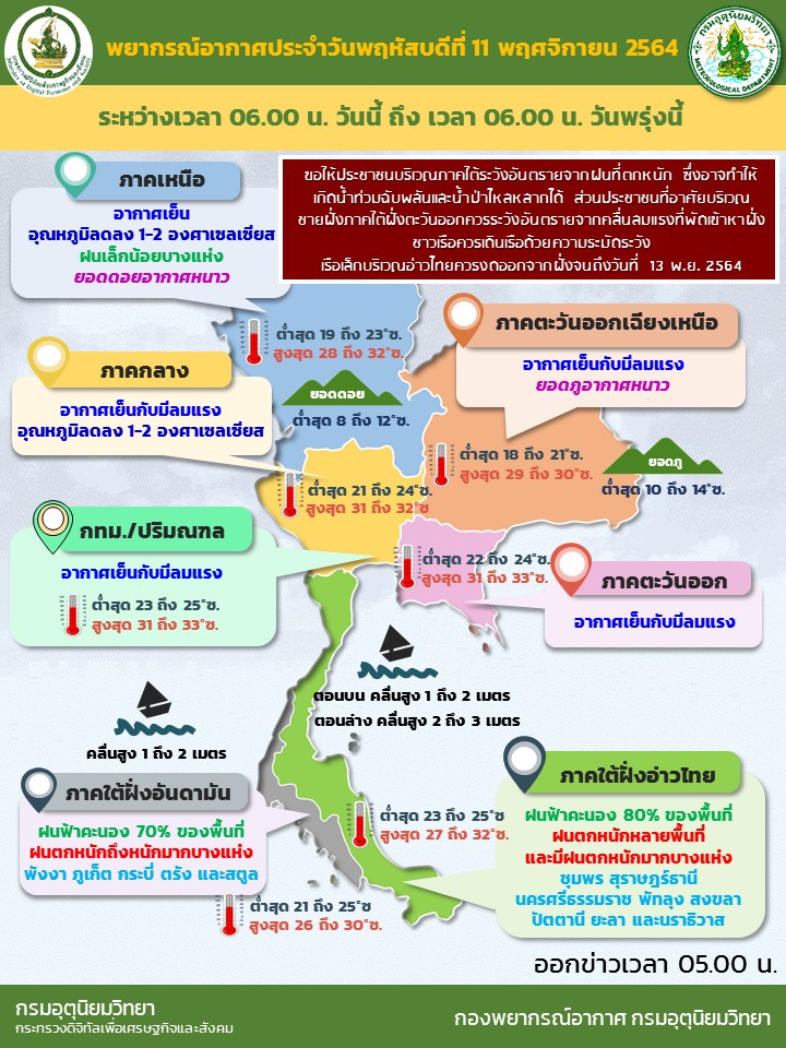 สำหรับมรสุมตะวันออกเฉียงเหนือที่พัดปกคลุมอ่าวไทย ภาคใต้ และทะเลอันดามันมีกำลังแรง ทำให้ภาคใต้มีฝนตกหนักหลายพื้นที่และมีฝนตกหนักมากบางแห่ง ส่วนคลื่นลมบริเวณอ่าวไทยและทะเลอันดามันมีกำลังแรงขึ้น โดยอ่าวไทยคลื่นสูง 2-3 เมตร บริเวณที่มีฝนฟ้าคะนองคลื่นสูงมากกว่า 3 เมตร และทะเลอันดามันคลื่นสูง 1-2 เมตร ขอให้ประชาชนบริเวณภาคใต้ระวังอันตรายจากฝนที่ตกหนักซึ่งอาจทำให้เกิดน้ำท่วมฉับพลันและน้ำป่าไหลหลากได้ ส่วนประชาชนที่อาศัยบริเวณชายฝั่งภาคใต้ฝั่งตะวันออกควรระวังอันตรายจากคลื่นลมแรงที่พัดเข้าหาฝั่ง ชาวเรือควรเดินเรือด้วยความระมัดระวัง เรือเล็กบริเวณอ่าวไทยควรงดออกจากฝั่งจนถึงวันที่ 13 พฤศจิกายน 2564