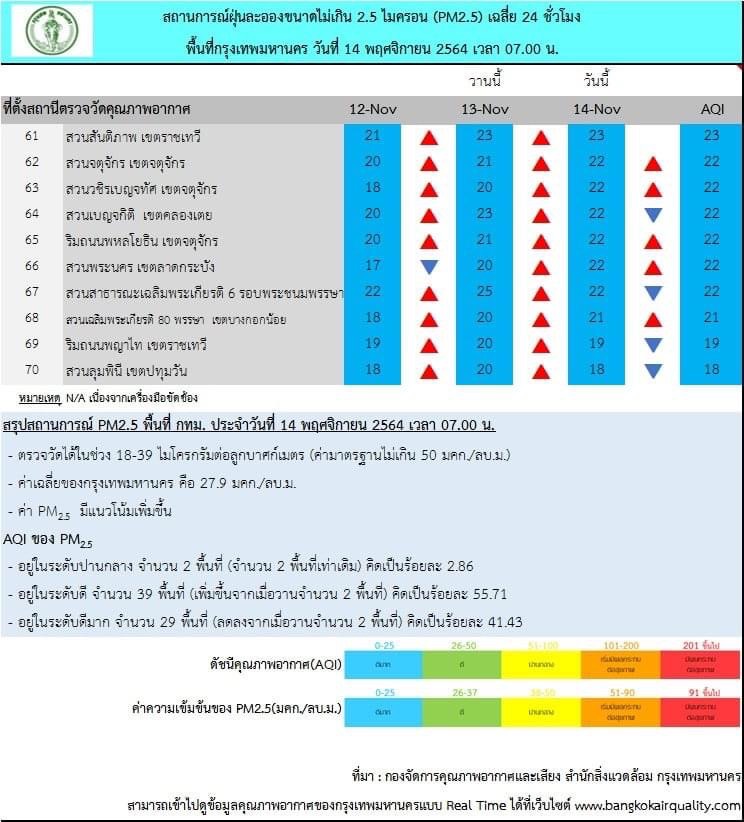 วันนี้ (14 พ.ย. 64) ศูนย์ประสานงานและแก้ไขปัญหามลพิษทางอากาศ กรุงเทพมหานคร รายงานสถานการณ์ฝุ่นละอองขนาดไม่เกิน 2.5 ไมครอน (PM 2.5) ของสถานีตรวจวัดคุณภาพอากาศกรุงเทพมหานคร เวลา 07.00 น. ค่าเฉลี่ย 24 ชั่วโมง ของฝุ่นละอองขนาดไม่เกิน 2.5 ไมครอน (PM2.5) ตรวจวัดได้ 18-39 ไมโครกรัม/ลูกบาศก์เมตร (มคก./ลบ.ม.) ไม่เกินมาตรฐานทุกพื้นที่ที่มีการตรวจวัด ดัชนีคุณภาพอากาศส่วนใหญ่อยู่ในระดับคุณภาพอากาศดี