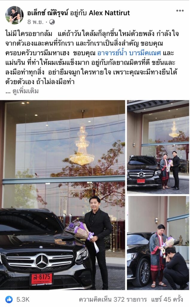 ได้โพสต์บอกใบ้หวยผ่านเลขทะเบียนรถป้ายแดง ใจความว่า ‘ไม่มีใครอยากล้ม แต่ถ้าวันใดล้มก็ลุกขึ้นใหม่ด้วยพลัง กำลังใจจากตัวเองและคนที่รักเรา และรักเราเป็นสิ่งสำคัญ ขอบคุณครอบครัวบารมีมหาเฮง ขอบคุณ อาจารย์น้ำ บารมีคเณศ และ แม่นริน ที่ทำให้ผมเข้มแข็งมาก อยู่กับกัลยาณมิตรที่ดี ขยันและลงมือทำทุกสิ่ง อย่ายืมจมูกใครหายใจ เพราะคุณจะมีทางยืนได้ด้วยตัวเอง ถ้าไม่ลงมือทำถ้าคุณผ่านช่วงเวลาร้ายๆไปได้…คุณจะภูมิใจในตัวเอง…และจงเชื่อไว้เสมอ…ว่าประสบการณ์ร้ายๆจะสร้างชีวิตใหม่ที่ดีกว่า ผมรักตัวเอง…ที่ขยัน…อดทน..คิดบวก…เชื่อมั่นในสิ่งศักดิ์ และมีครูบาอาจารย์ และกัลยาณมิตรที่ดีที่อยูเอาด้วยกันเสมอ ใครคิดลบเว้นระยะห่าง อยู่กับคนที่รัก และจริงใจกับเรา ขอบคุณครับ’