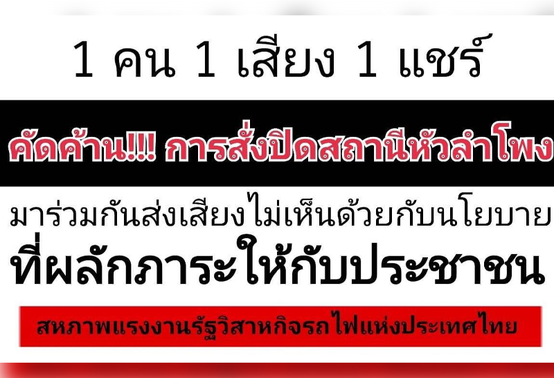 โดยทาง สหภาพแรงงานรัฐวิสาหกิจรถไฟฯ ขอคัดค้านไม่เห็นด้วยกับนโยบายการหยุดให้บริการรถไฟเข้าสถานีกรุงเทพ (หัวลำโพง) และขอแจ้งให้พี่น้องสมาชิก สร.รฟท. คนรถไฟทุกท่าน รวมทั้งพี่น้องประชาชนผู้ที่รักความเป็นธรรม ในสังคมได้รับทราบและได้ร่วมกันแสดงความคิดเห็นร่วมกันออกมาคัดค้านนโยบายของรัฐมนตรีว่าการกระทรวงคมนาคมที่ให้การรถไฟฯ หยุดให้บริการรถไฟเข้าสถานีกรุงเทพ (หัวลำโพง) ซึ่งเป็นขบวนการทำลายประวัติศาสตร์ของการรถไฟฯ เพื่อสืบทอดเจตนารมณ์พระราชปณิธาน ของสมเด็จพระปิยมหาราชที่มีมาอย่างยาวนาน และทรงพระราชทาน “กิจการรถไฟ” ไว้เพื่อประโยชน์แห่งรัฐและประชาชน
