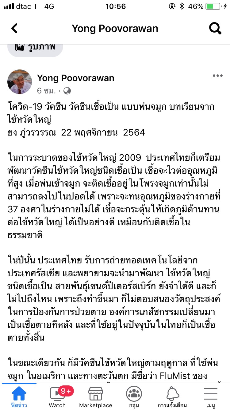 ศ.นพ.ยง ภู่วรวรรณ หัวหน้าศูนย์เชี่ยวชาญเฉพาะทางด้านไวรัสวิทยาคลินิก ภาควิชากุมารเวชศาสตร์ คณะแพทยศาสตร์ จุฬาลงกรณ์มหาวิทยาลัย ได้โพสต์ข้อความลงในเฟซบุ๊กส่วนตัว”Yong Poovorawan” เรื่อง”โควิด-19 วัคซีน วัคซีนเชื้อเป็น แบบพ่นจมูก บทเรียนจากไข้หวัดใหญ่ว่า ในการระบาดของไข้หวัดใหญ่ 2009 ประเทศไทยก็เตรียมพัฒนาวัคซีนไข้หวัดใหญ่ชนิดเชื้อเป็น เชื้อจะไวต่ออุณหภูมิที่สูงเมื่อพ่นเข้าจมูก จะติดเชื้ออยู่ในโพรงจมูกเท่านั้นไม่สามารถลงไปในปอดได้ เพราะจะทนอุณหภูมิของร่างกายที่ 37 องศาในร่างกายไม่ได้ เชื้อจะกระตุ้นให้เกิดภูมิต้านทานต่อไข้หวัดใหญ่ได้เป็นอย่างดี เหมือนกับติดเชื้อในธรรมชาติ ในปีนั้นประเทศไทย รับการถ่ายทอดเทคโนโลยีจากประเทศรัสเซียและพยายามจะนำมาพัฒนาไข้หวัดใหญ่ชนิดเชื้อเป็น สายพันธุ์เซนต์ปีเตอร์สเบิร์ก ยังจำได้ดีและก็ไม่ไปถึงไหนเพราะถึงทำขึ้นมา ก็ไม่ตอบสนองวัตถุประสงค์ในการป้องกันการป่วยตาย องค์การเภสัชกรรมเปลี่ยนมาเป็นเชื้อตายทีหลัง และที่ใช้อยู่ในปัจจุบันในไทยก็เป็นเชื้อตายทั้งสิ้น