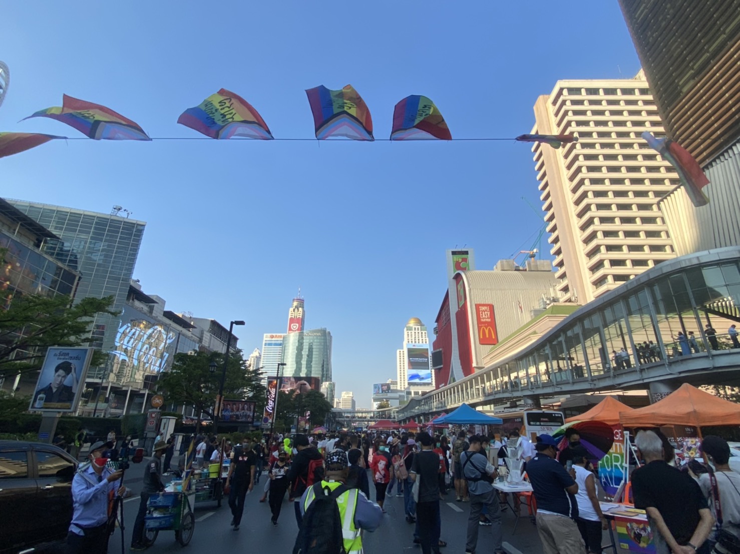 บรรยากาศการชุมนุมที่บริเวณแยกราชประสงค์ หลังมีการประกาศนัดหมายโดยกลุ่มภาคีสีรุ้งเพื่อสมรสเท่าเทียม ร่วมด้วย HER , เฟมินิสต์ปลดแอก , ทะลุฟ้า และกลุ่มอิสระอื่น ๆ พบว่าในช่วงเวลา 16.00 น. เริ่มมีมวลชนทยอยลงพื้นที่ตามการนัดหมายอย่างต่อเนื่อง