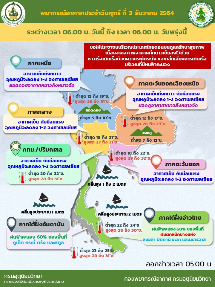 พยากรณ์อากาศประจำวันที่ 3 ธันวาคม 2564 พยากรณ์อากาศ 24 ชั่วโมงข้างหน้า บริเวณความกดอากาศสูงหรือมวลอากาศเย็นกำลังค่อนข้างแรงจากประเทศจีนยังคงแผ่ลงมาปกคลุมประเทศไทยตอนบนและทะเลจีนใต้ ทำให้บริเวณดังกล่าวมีอากาศเย็นถึงหนาวกับมีลมแรง อุณหภูมิจะลดลง 1-2 องศาเซลเซียส กับมีน้ำค้างบางแห่งบริเวณยอดดอยของภาคเหนือ ขอให้ประชาชนบริเวณประเทศไทยตอนบนดูแลรักษาสุขภาพเนื่องจากสภาพอากาศที่หนาวเย็นลงไว้ด้วย
