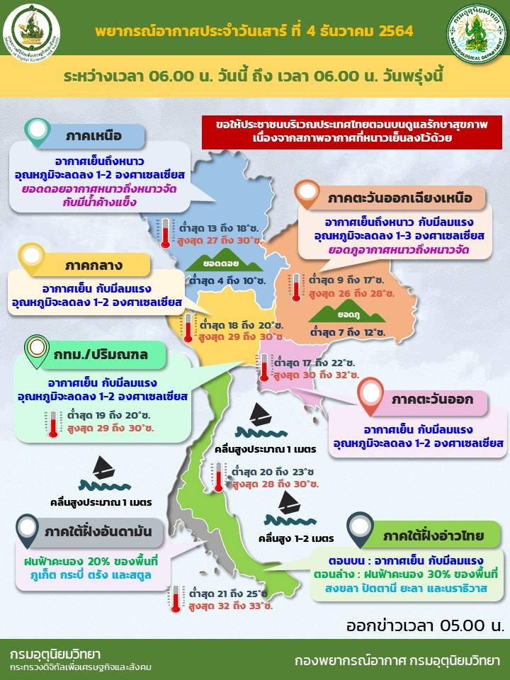 กรมอุตุนิยมวิทยารายงานลักษณะอากาศทั่วไป พยากรณ์อากาศ 24 ชั่วโมงข้างหน้า บริเวณความกดอากาศสูงหรือมวลอากาศเย็นกำลังแรงจากประเทศจีนแผ่ปกคลุมประเทศไทย ทำให้บริเวณดังกล่าวมีอากาศเย็นถึงหนาวกับมีลมแรง อุณหภูมิจะลดลงอีก 1-3 องศาเซลเซียส สำหรับบริเวณยอดดอยมีอากาศหนาวถึงหนาวจัดกับมีน้ำค้างบางแห่ง อุณหภูมิต่ำสุด 4-10 องศาเซลเซียส ส่วนบริเวณยอดภูมีอากาศหนาวถึงหนาวจัด อุณหภูมิต่ำสุด 7-12 องศาเซลเซียส ขอให้ประชาชนบริเวณประเทศไทยตอนบนดูแลรักษาสุขภาพ เนื่องจากสภาพอากาศที่หนาวเย็นลงไว้ด้วย สำหรับมรสุมตะวันออกเฉียงเหนือที่พัดปกคลุมอ่าวไทยและภาคใต้มีกำลังอ่อนลง ลักษณะเช่นนี้ทำให้ภาคใต้มีฝนลดลง