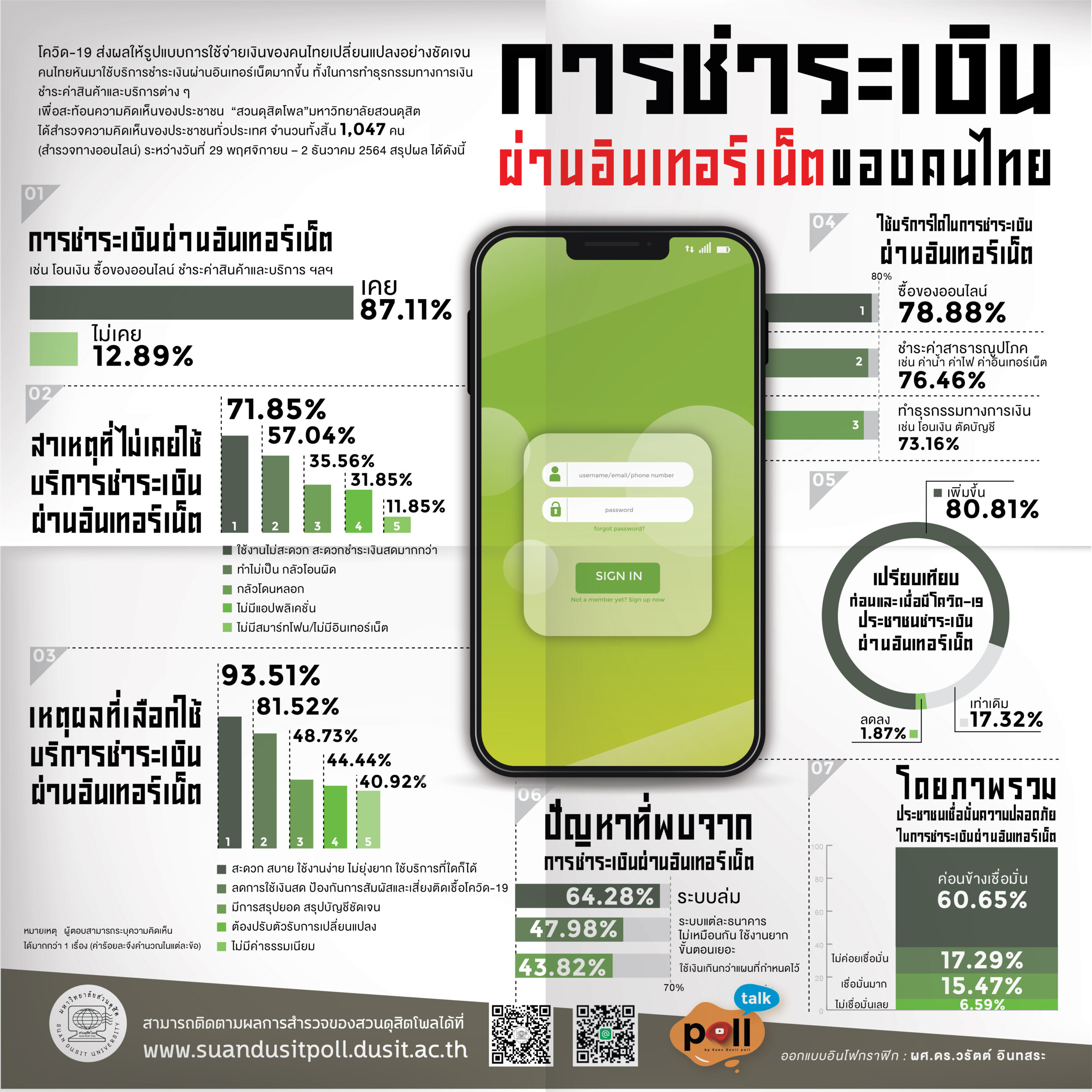 โดยเหตุผลของคนใช้บริการชำระเงินผ่านอินเทอร์เน็ต ร้อยละ 93.51 สะดวก ใช้งานง่าย, ร้อยละ 81.52 ลดการใช้เงินสด ป้องกันโควิด-19, ขณะที่เหตุผลของคนที่ไม่เคยใช้ร้อยละ 71.85 สะดวกชำระเงินสดมากกว่า,ร้อยละ 57.04 ทำไม่เป็น กลัวโอนผิด ร้อยละ 35.56 กลัวโดนหลอก และ ร้อยละ 11.85 ไม่มีสมาร์ทโฟน/ไม่มีอินเทอร์เน็ต
