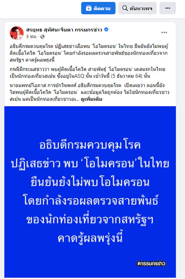 วันนี้ (5 ธ.ค. 64) เฟซบุ๊กเพจ “สรยุทธ สุทัศนะจินดา กรรมกรข่าว” เปิดเผยว่า อธิบดีกรมควบคุมโรค ปฏิเสธข่าวลือพบ ‘โอไมครอน’ ในไทย ยืนยันยังไม่พบผู้ติดเชื้อโควิด ‘โอไมครอน’ โดยกำลังรอผลตรวจสายพันธุ์ของนักท่องเที่ยวจากสหรัฐฯ คาดรู้ผลพรุ่งนี้ กรณีมีกระแสข่าวว่าพบผู้ติดเชื้อโควิดสายพันธุ์ ‘โอไมครอน’ เคสแรกในไทย เป็นนักท่องเที่ยวสเปน ซึ่งอยู่ใน ASQ เช้าวันนี้ (5 ธันวาคม 64) นั้น