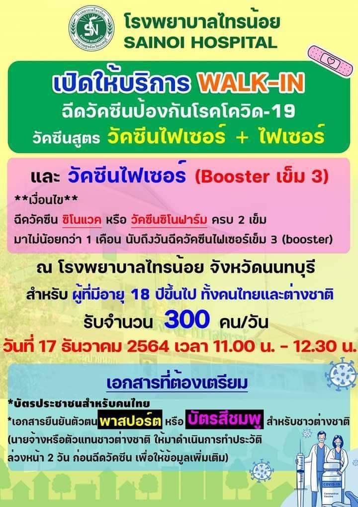 โรงพยาบาลไทรน้อย จ.นนทบุรี เปิด Walk-in ให้บริการฉีดวัคซีนโควิด-19 แก่ผู้ที่อายุ 18 ปีขึ้นไป ทั้งคนไทยและชาวต่างชาติ ในวันที่ 17 ธันวาคม 2564 เวลา 11.00-12.00 น.โดยโรงพยาบาลไทรน้อยเปิดให้บริการฉีดวัคซีน 2 รูปแบบได้แก่