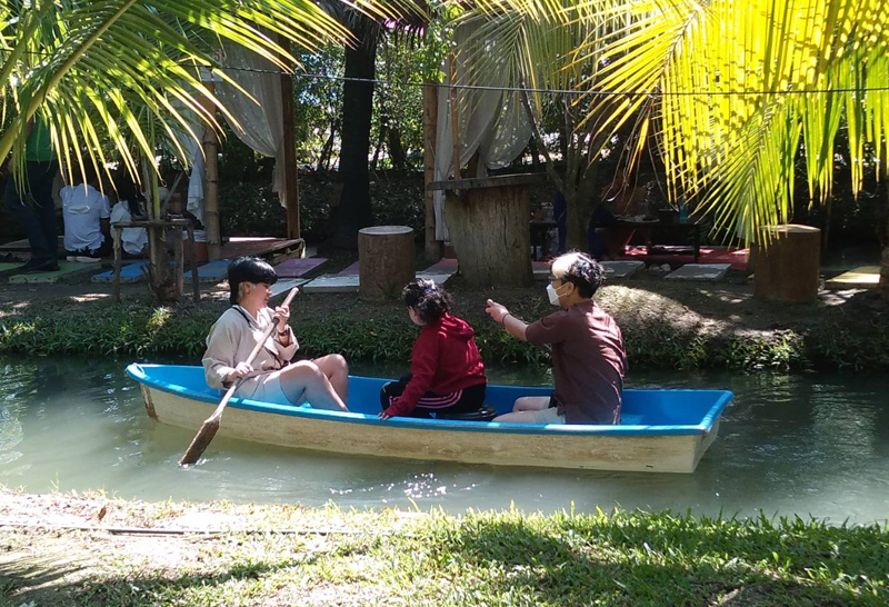 โดย ร้าน “O2 Kaffee & Bistro” บรรยากาศวันนี้เป็นไปอย่างคึกคัก ถือเป็นคาเฟ่กลางท้องร่องสวนมะพร้าว แห่งแรกๆ ที่ถูกดัดแปลงเป็นคาเฟ่ มีที่นั่งยื่นลงไปในน้ำให้จิบกาแฟ ทานอาหาร พร้อมดูปลา จุ่มขาลงน้ำให้ผ่อนคลายแบบสบายๆ นอกจากนี้ ยังมีเรือให้ลูกค้าพายเล่น หรือจะเดินชมรอบสวน นอกจากบรรยากาศจะดีแล้ว เครื่องดื่ม Signature ของที่นี่ ก็ต้องลอง เพราะได้ส่วนผสมของมะพร้าวสดๆ จากในสวนมาเสริม ทั้งหอม หวาน และกลมกล่อม อย่างกาแฟมะพร้าว อัญชันมะพร้าวน้ำหอม เค้กมะพร้าว ส่วนอาหารที่ต้องลิ้มรสต้องไม่พลาดเมนู ผัดไทยกุ้งสด ตำส้มโอ ยำปลาแซลมอนไหลบัว ข้าวผัดดอกอัญชัน รสชาติดีราคาไม่แพงเกินไปถือว่าคุ้มค่า ที่สำคัญพนักงานบริการดี ยิ้มแย้มเอาใจใส่ดูแลลูกค้าอย่างทั่วถึง