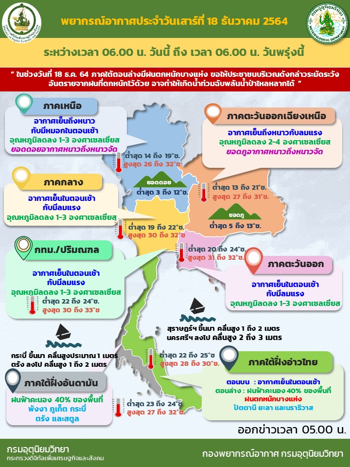 พยากรณ์อากาศ ประจำวันที่ 18 ธันวาคม 2564 ลักษณะอากาศทั่วไป 24 ชั่วโมงข้างหน้า บริเวณความกดอากาศสูงหรือมวลอากาศเย็นกำลังค่อนข้างแรงอีกระลอกหนึ่งจากประเทศจีนได้แผ่ลงมาปกคลุมประเทศไทยตอนบนแล้ว ลักษณะเช่นนี้ทำให้บริเวณดังกล่าวมีอากาศเย็นถึงหนาวกับมีลมแรง โดยอุณหภูมิจะลดลง 2-4 องศาเซลเซียส ในภาคตะวันออกเฉียงเหนือ ส่วนภาคเหนือ ภาคกลาง และภาคตะวันออก อุณหภูมิจะลดลง 1-3 องศาเซลเซียส สำหรับยอดดอยมีอากาศหนาวถึงหนาวจัด อุณหภูมิต่ำสุด 3-12 องศาเซลเซียส และยอดภูมีอากาศหนาวถึงหนาวจัด อุณหภูมิต่ำสุด 5-13 องศาเซลเซียส ขอให้ประชาชนบริเวณประเทศไทยตอนบนดูแลรักษาสุขภาพเนื่องจากสภาพอากาศที่หนาวเย็นลงในระยะนี้ไว้ด้วย