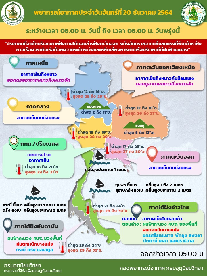 พยากรณ์อากาศ ประจำวันที่ 20 ธันวาคม 2564 ลักษณะอากาศ ทั่วไป24 ชั่วโมงข้างหน้า บริเวณความกดอากาศสูงหรือมวลอากาศเย็นกำลังค่อนข้างแรงยังคงแผ่ปกคลุมประเทศไทยตอนบน ลักษณะเช่นนี้ทำให้บริเวณดังกล่าวยังคงมีอากาศเย็นถึงหนาวในภาคเหนือ และภาคตะวันออกเฉียงเหนือ ส่วนภาคกลาง และภาคตะวันออกมีอากาศเย็นกับมีลมแรง สำหรับยอดดอยมีอากาศหนาวถึงหนาวจัด อุณหภูมิต่ำสุด 2-11 องศาเซลเซียส และยอดภูมีอากาศหนาวถึงหนาวจัด อุณหภูมิต่ำสุด 5-13 องศาเซลเซียส ขอให้ประชาชนบริเวณประเทศไทยตอนบนดูแลรักษาสุขภาพเนื่องจากสภาพอากาศที่หนาวเย็นลงในระยะนี้ไว้ด้วย