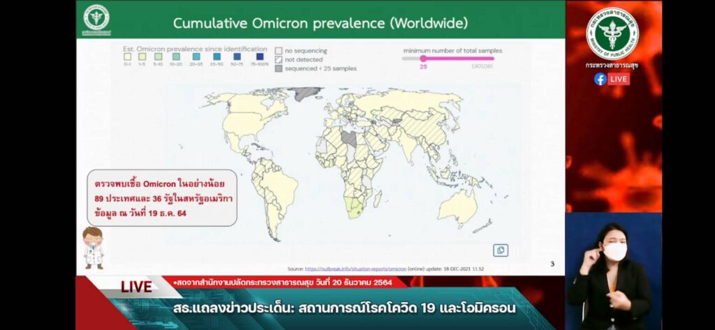 นายแพทย์ศุภกิจ ศิริลักษณ์ อธิบดีกรมวิทยาศาสตร์การแพทย์ แถลงสถานการณ์ความคืบหน้าโรคไวรัสโคโรนา 2019 หรือ โควิด 19 สายพันธุ์โอไมครอน ว่า ขณะนี้สถานการณ์การติดเชื้อโควิดสายพันธุ์โอไมครอนแล้ว 89 ประเทศพบติดเชื้อ ส่วนในสหรัฐ พบการติดเชื้อโอไมครอนแพร่กระจายไปใน 36 รัฐ ปัจจุบันนี้พบสายพันธุ์ย่อยของโอไมครอนรวม 3 สาย และแม้จะมีสายพันธุ์ย่อยของโอไมครอน แต่ก็ยังคงตรวจยืนยันเชื้อได้ ตั้งแต่วันที่ 11-19 ธันวาคม ที่ผ่านมา มีการตรวจพบเชื้อโควิด 19 จากผู้ที่เดินทางมาจากต่างประเทศรวม 1541 ราย แต่เมื่อแยกสายพันธุ์ แล้ว พบว่าเป็นโอไมครอน 63 ราย และอยู่ระหว่างการรอยืนยันเชื้ออีก 20 ราย