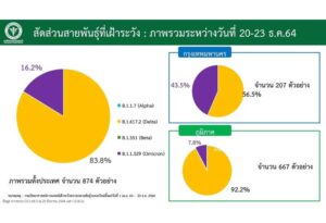 สำหรับสายพันธุ์หลักที่มีการแพร่ระบาดในประเทศไทยขณะนี้ ยังเป็นสายพันธุ์เดลตา ซึ่งจากการเก็บข้อมูลช่วงวันที่ 20-23 ธ.ค. พบว่าเป็นสายพันธุ์เดลต้า ร้อยละ 83.3 และสายพันธุ์โอมิครอน ร้อยละ16.2