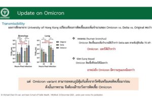 วันนี้ (24 ธ.ค. 64) นายแพทย์ศุภกิจ ศิริลักษณ์ อธิบดีกรมวิทยาศาสตร์การแพทย์ และนพ.เฉวตรฉัตร นามวาท ผู้อำนวยการกองควบคุมโรคและภัยสุขภาพในภาวะฉุกเฉิน แถลงถึงสถานการณ์โควิด-19 และโอไมครอน ผ่าน Facebook Live กระทรวงสาธารณสุข ระบุว่า เชื้อโควิด-19 สายพันธุ์โอไมครอน สามารถแพร่ระบาดได้รวดเร็วกว่าสายพันธุ์เดลตาถึง 70 เท่า แต่จะไม่ก่ออันตรายต่อปอดเท่าสายพันธุ์เดลตา โดยจากการศึกษาหลายหน่วยงานเห็นตรงกันว่าการรับวัคซีนจะช่วยสร้างภูมิคุ้มกันป้องกันสายพันธุ์โอมิครอนได้อย่างดี อย่างไรก็ตาม คาดว่าการระบาดของโอไมครอนในประเทศไทยจะอยู่ในวงแคบ เนื่องจากมีการปฏิบัติตามมาตรการและการฉีดวัคซีน