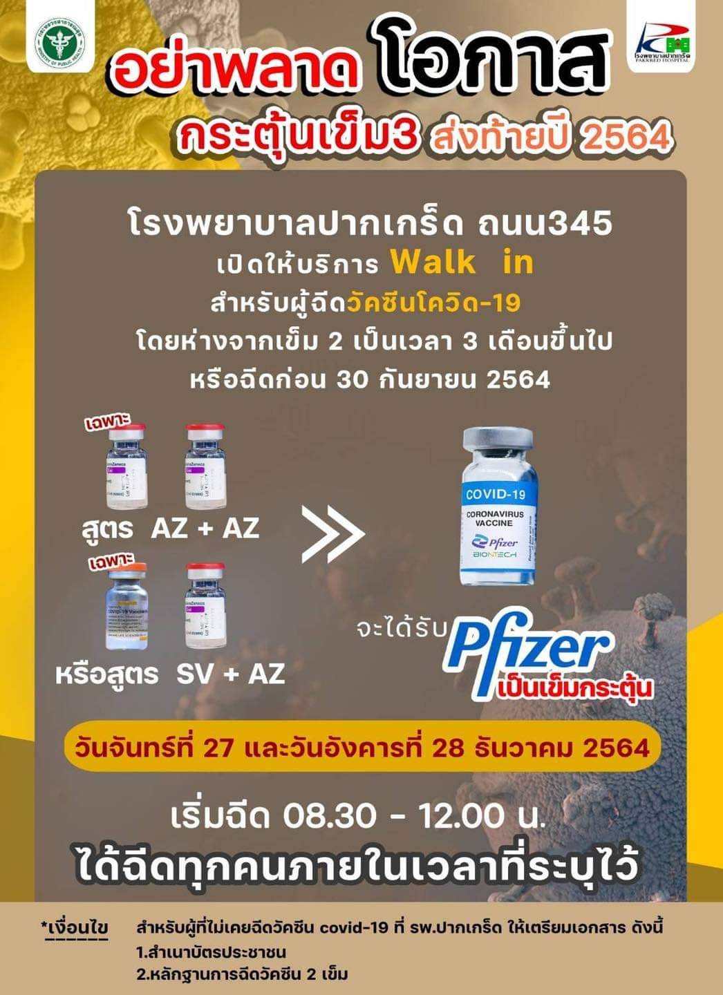 สำหรับผู้ที่ฉีดวัคซีน AstraZeneca 2 เข็ม หรือสูตรไขว้ Sinovac +AstraZeneca ที่ฉีดเข็มสองเป็นเวลา สามเดือนขึ้นไปหรือก่อน 30 กันยายน 2564 ในสัปดาห์ก่อนสิ้นปี วันที่ 27และ 28 ธันวาคม 2564 เวลา 8.30 น.-12.00 น. รับทุกคนในเวลาที่กำหนดที่โรงพยาบาลปากเกร็ด ถนน345ไม่ต้องลงทะเบียน Walk in มาได้เลย