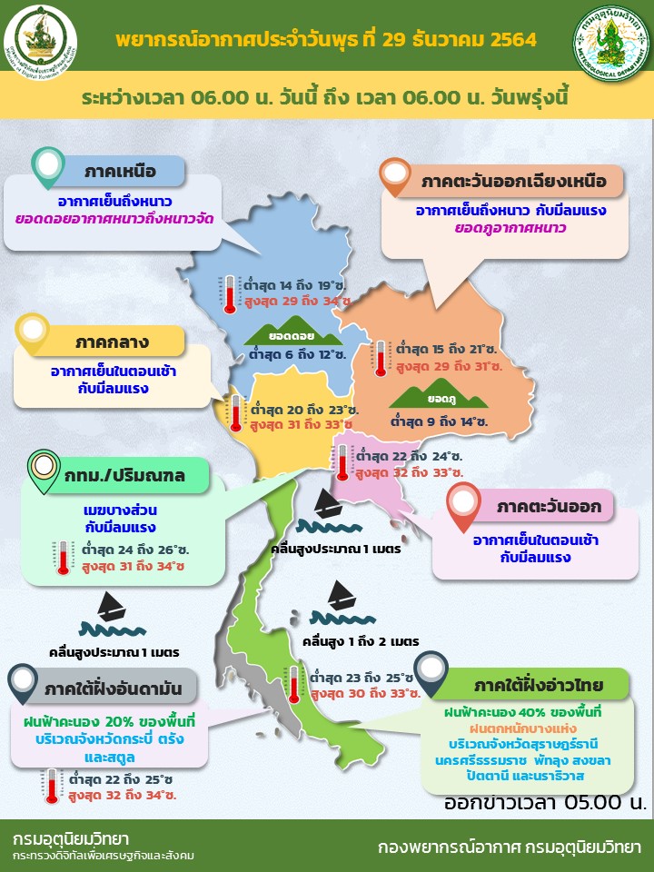พยากรณ์อากาศ ประจำวันที่ 29 ธันวาคม 2564 ลักษณะอากาศทั่วไป 24 ชั่วโมงข้างหน้า บริเวณความกดอากาศสูงหรือมวลอากาศเย็นกำลังค่อนข้างแรงปกคลุมประเทศไทยตอนบน ลักษณะเช่นนี้ทำให้บริเวณดังกล่าวยังคงมีอากาศเย็นถึงหนาว กับมีลมแรง โดยภาคเหนือและภาคตะวันออกเฉียงเหนือมีอากาศเย็นถึงหนาว ส่วนภาคกลางและภาคตะวันออก มีอากาศเย็น สำหรับยอดดอยมีอากาศหนาวถึงหนาวจัด อุณหภูมิต่ำสุด 6-12 องศาเซลเซียส และยอดภูมีอากาศหนาว อุณหภูมิต่ำสุด 9-14 องศาเซลเซียส ขอให้ประชาชนบริเวณประเทศไทยตอนบนดูแลรักษาสุขภาพเนื่องจากสภาพอากาศที่เปลี่ยนแปลงไว้ด้วย สำหรับมรสุมตะวันออกเฉียงเหนือที่พัดปกคลุมอ่าวไทยมีกำลังปานกลาง ทำให้บริเวณอ่าวไทยมีคลื่นสูง 1-2 เมตร ขอให้ชาวเรือบริเวณอ่าวไทยเดินเรือด้วยความระมัดระวัง