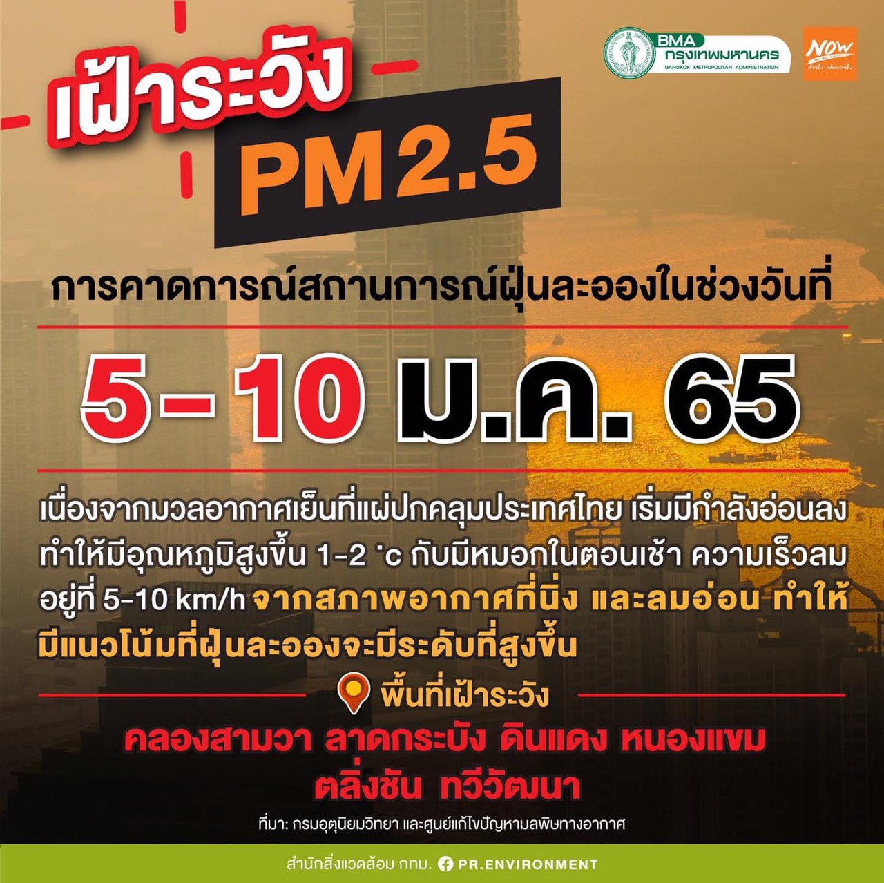 นายชาตรี วัฒนเขจร รองปลัดกรุงเทพมหานคร เปิดเผยว่า ตามที่กรมควบคุมมลพิษและกรมอุตุนิยมวิทยาได้คาดการณ์สถานการณ์ฝุ่นละออง PM2.5 ในพื้นที่กรุงเทพฯ และปริมณฑล ระหว่างวันที่ 4-10 ม.ค. 65 มีปริมาณสูงขึ้น เนื่องจากสภาพอากาศนิ่งและลมอ่อน โดยเฉพาะวันที่ต้องเฝ้าระวังเป็นพิเศษ คือ วันที่ 5-6 ม.ค. 65 และพื้นที่เฝ้าระวัง ได้แก่ หนองแขม ทวีวัฒนา ตลิ่งชัน คลองสามวา ลาดกระบัง และดินแดง